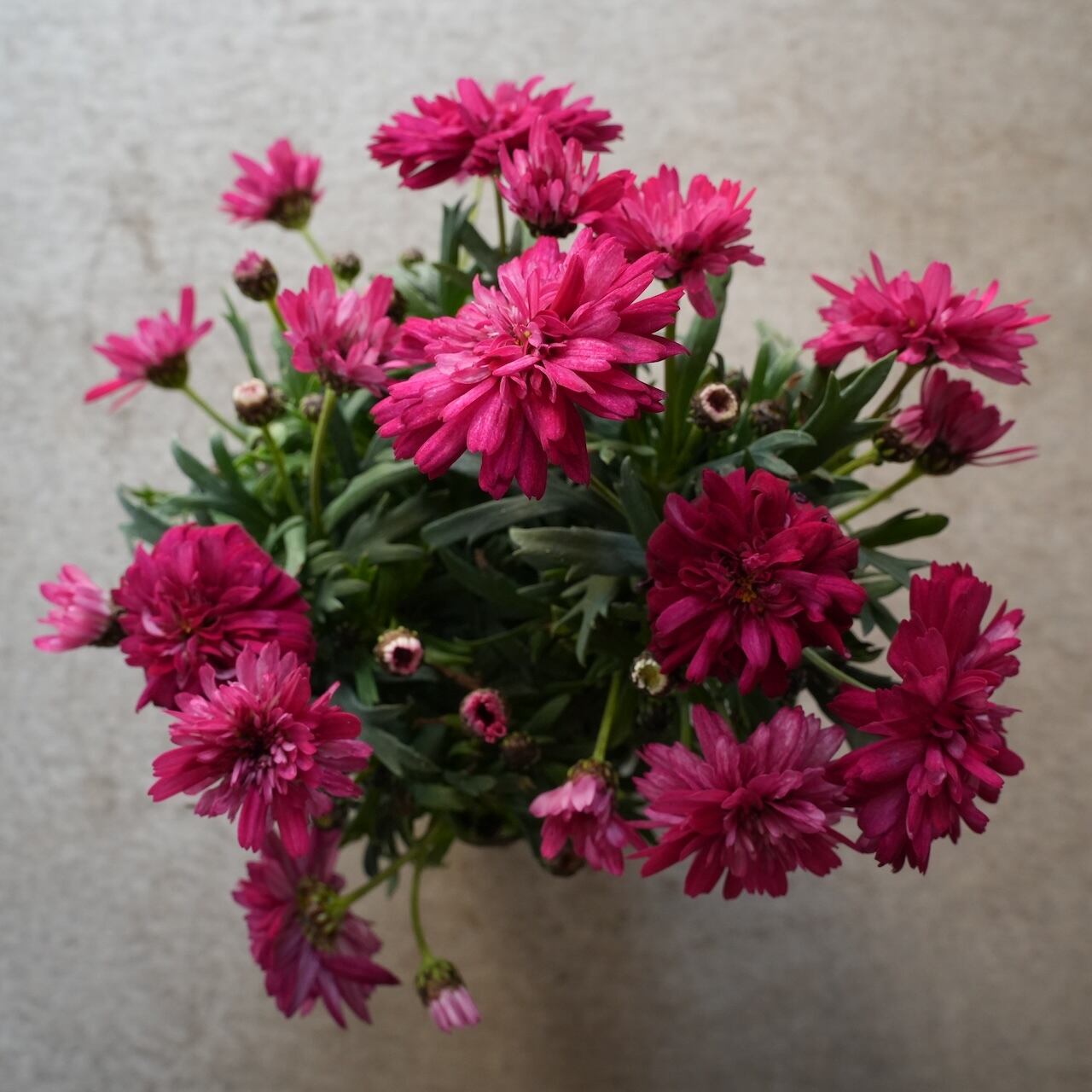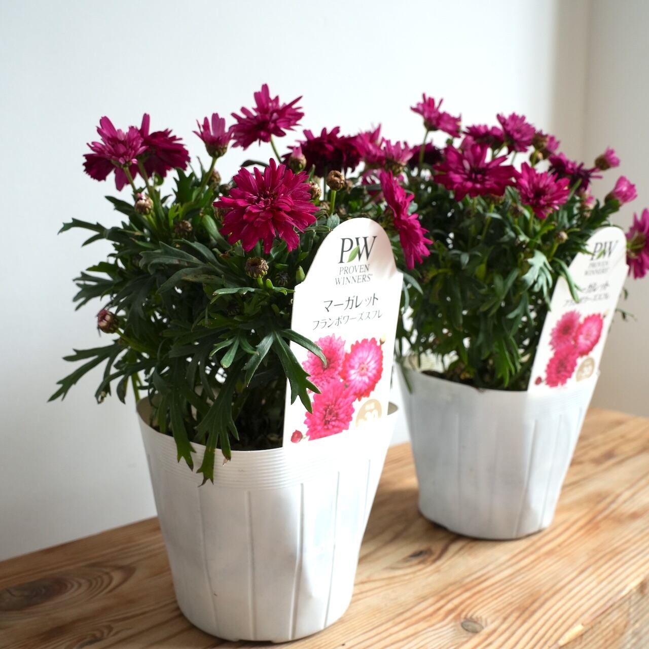 PWブランドの八重咲きマーガレットです。ラズベリーカラーの鮮やかピンクが魅力の品種です。ポンポンザ咲きでスフレのようなふんわりと柔らかい印象の花を咲かせます。